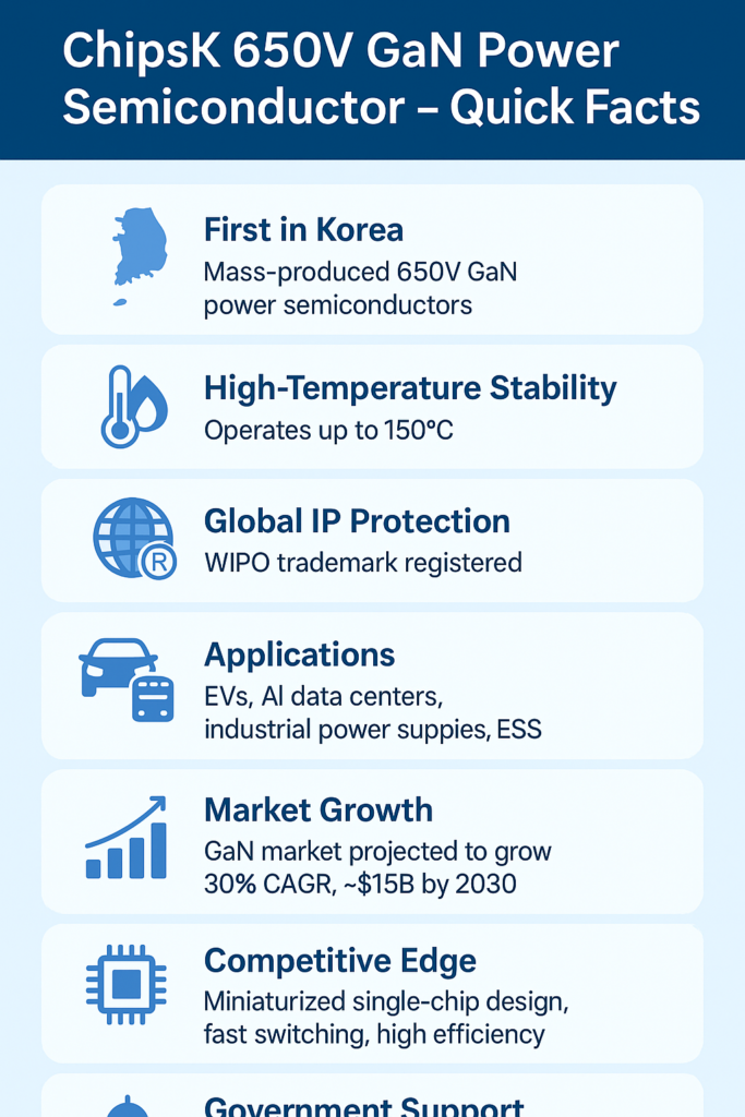 ChipsK’s achievement is historic for Korea. It began mass production of 650V GaN power semiconductors in June 2025, the first company in the country to do so.